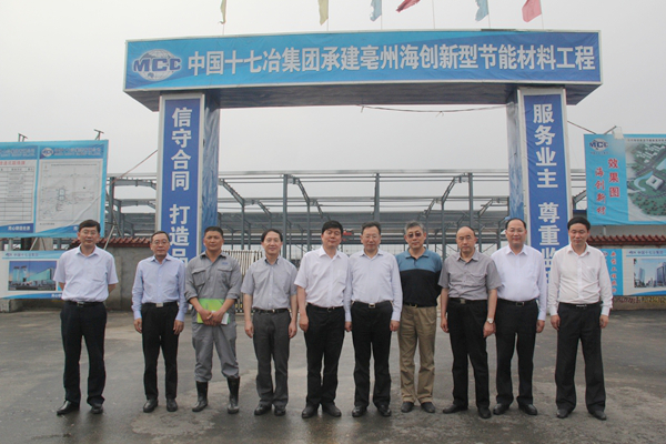 ? ? 在公司領導的帶領下,陳副省長一行首先來到項目現場宣傳展板前,李總向陳副省長詳細介紹了亳州海創新材料公司的基本情況、投資規模、產品特點、市場前景以及當前工程建設進度等有關情況。他介紹說:亳州海創新材料公司是中國海螺創業控股有限公司下屬全資子公司,于2013年8月27日注冊成立,是一家主要致力于新型節能綠色建筑材料研發、制造、銷售、應用及建筑、安裝等業務的企業。一期纖維水泥板(CCA)項目引進歐洲先進成套設備及工藝技術,項目工程于2013年10月23日正式開工建設,預計今年9月建成投產,陳副省長聽后非常高興。