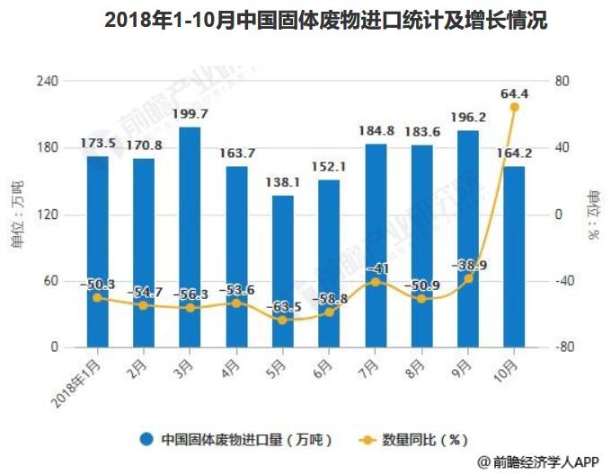 ? ? 據前瞻產業研究院發布的《固廢處理行業市場前瞻與投資戰略規劃分析報告》統計數據顯示,2018年5-9月中國固體廢物進口量呈增長趨勢,2018年10月中國固體廢物進口量明顯下降。2018年10月中國固體廢物進口量為164.2萬噸,同比增長64.4%。截止到2018年截至11月15日,2018年全國固體廢物進口量為1861萬噸,同比減少52.8%。