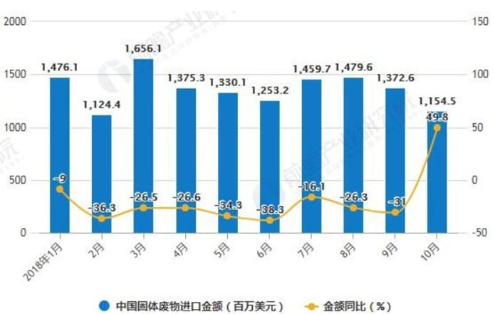 ? ? 在進口金額方面,2018年8-9月中國固體廢物進口金額下降,2018年10月中國固體廢物進口金額維持下降趨勢。2018年10月中國固體廢物進口金額為1155百萬美元,同比增長49.8%。