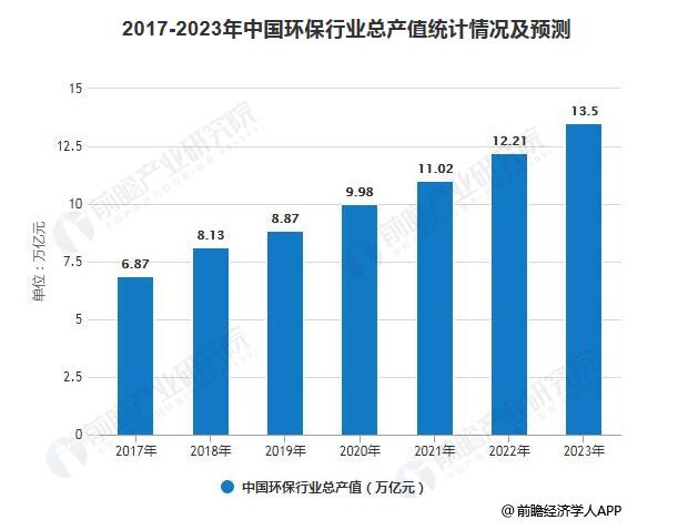 ? ? 據(jù)前瞻產(chǎn)業(yè)研究院發(fā)布的《中國環(huán)保行業(yè)發(fā)展前景與投資預(yù)測分析報告》統(tǒng)計數(shù)據(jù)顯示,截止至2017年中國環(huán)保行業(yè)總產(chǎn)值達到6.87萬億元,前瞻初步測算2018年中國環(huán)保行業(yè)總產(chǎn)值將達8.13萬億元左右。預(yù)測2019年中國環(huán)保行業(yè)總產(chǎn)值將達8.87萬億元。未來五年(2019-2023)年均復(fù)合增長率約為11.07%,并預(yù)測在2023年中國環(huán)保行業(yè)總產(chǎn)值將接近14萬億元。