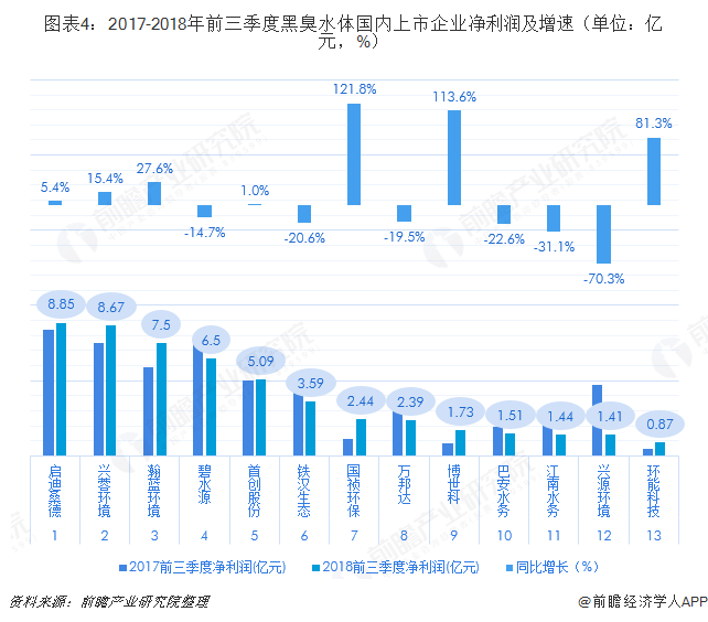 ? ? 前瞻產業研究院發布的《中國黑臭水體治理行業發展前景預測與投資戰略規劃分析報告》對黑臭水體治理產業鏈中的上市企業進行了深入解讀。整體來看,國內具備整合設計、建設、融投資和運營能力的環境治理運營商較少,參與黑臭水體治理的合格運營商數量較為有限。根據前瞻產業研究院的整理,目前在黑臭水體治理走在全國前列的環保企業主要有A股上市企業碧水源、啟迪桑德、首創股份、鐵漢生態、瀚藍環境、興蓉環境等,港股上市企業主要有康達國際環保,天津創業環保集團。