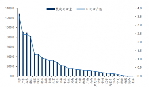2017年全國(guó)各省生活垃圾焚燒量(萬(wàn)噸)及日處理產(chǎn)能(萬(wàn)噸/日)