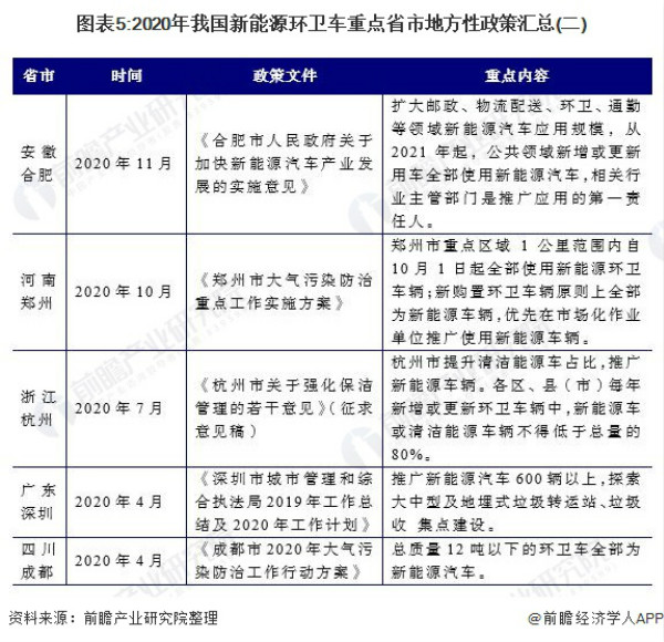 在地方層面,以省會(huì)城市為代表的大中型城市2020年密集出臺(tái)規(guī)劃政策,均對(duì)包括環(huán)衛(wèi)車在內(nèi)的公共領(lǐng)域用車新能源化提出要求,以最近的11月19日合肥發(fā)布的《加快新能源汽車產(chǎn)業(yè)發(fā)展的實(shí)施意見》為例,意見明確提出從2021年起,公共領(lǐng)域新增或更新用車全部使用新能源汽車,相關(guān)行業(yè)主管部門是推廣應(yīng)用的第一責(zé)任人。