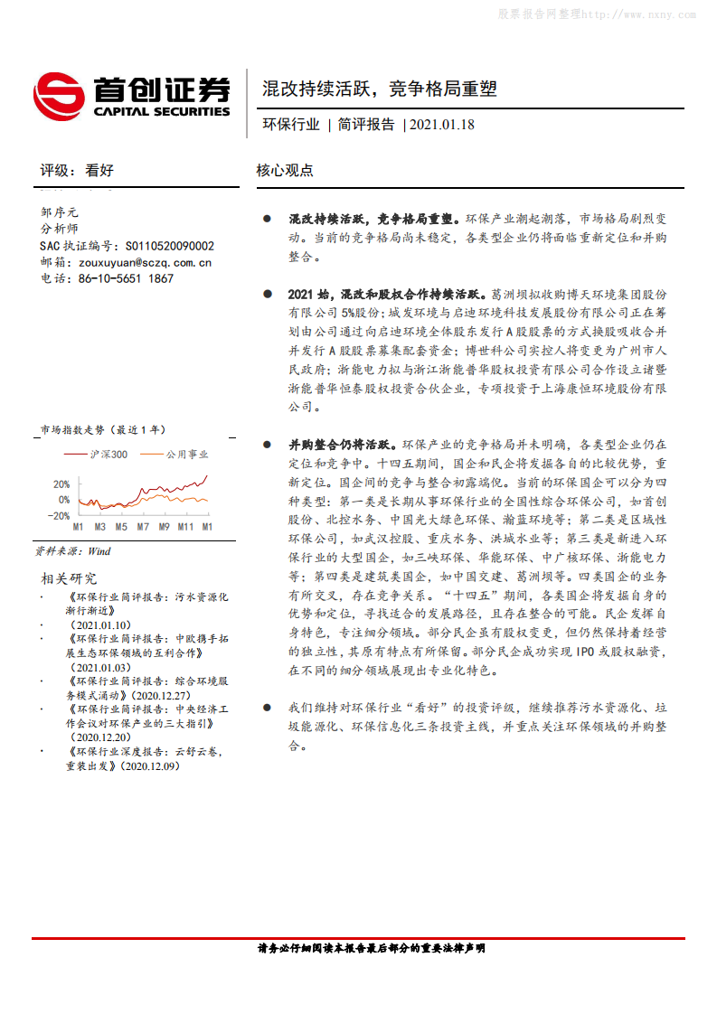 并購整合仍將活躍。環保產業的競爭格局并未明確,各類型企業仍在定位和競爭中。十四五期間,國企和民企將發掘各自的比較優勢,重新定位。國企間的競爭與整合初露端倪。當前的環保國企可以分為四種類型:第一類是長期從事環保行業的全國性綜合環保公司,如首創 股份、北控水務、中國光大綠色環保、瀚藍環境等;第二類是區域性環保公司,如武漢控股、重慶水務、洪城水業等;第三類是新進入環保行業的大型國企,如三峽環保、華能環保、中廣核環保、浙能電力等;第四類是建筑類國企,如中國交建、葛洲壩等。四類國企的業務 有所交叉,存在競爭關系。“十四五”期間,各類國企將發掘自身的 優勢和定位,尋找適合的發展路徑,且存在整合的可能。民企發揮自 身特色,專注細分領域。部分民企雖有股權變更,但仍然保持著經營 的獨立性,其原有特點有所保留。部分民企成功實現 IPO 或股權融資, 在不同的細分領域展現出專業化特色。