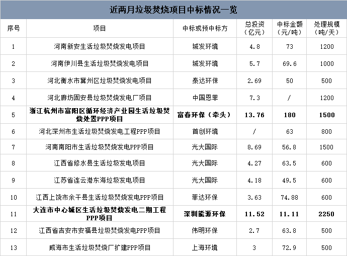 ? ? 第四,這兩月,出現了兩起比較特別的垃圾焚燒項目,一起是浙江杭州市富陽區循環經濟產業園生活垃圾焚燒處置PPP項目,該項目以180元/噸的中標價成為截止目前的年度最高中標價,另一起是大連市中心城區生活垃圾焚燒發電二期工程PPP項目,該項目最終花落深圳能源環保,中標價刷新歷史最低記錄,去到11.11元/噸。項目詳情可點擊附錄查看。
