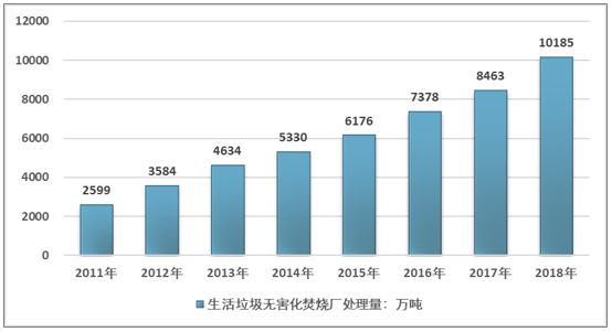 ? ? 2011年至 2017 年,我國生活垃圾焚燒處理量由2599萬噸增加至10185萬噸,年復(fù)合增長(zhǎng)率達(dá) 21.5%。