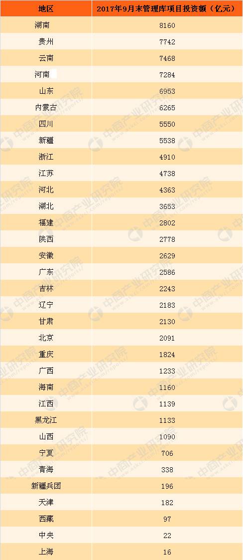 2017年9月末中國各地區(qū)PPP管理庫項(xiàng)目投資金額統(tǒng)計(jì)