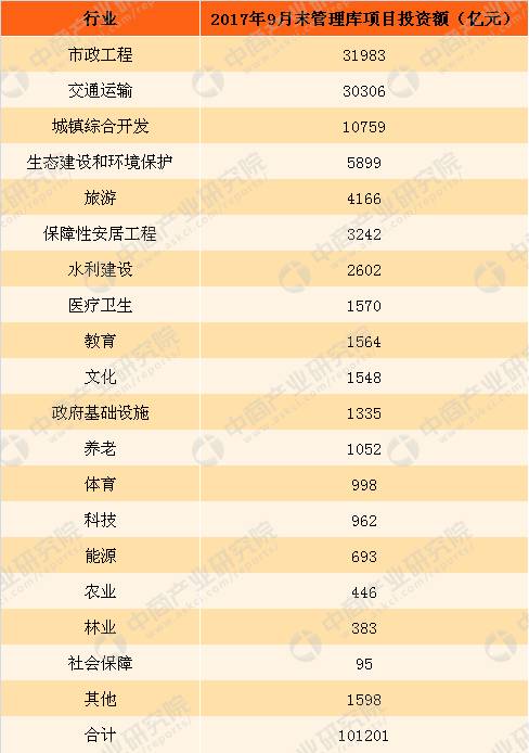 ? ? 截至2017年9月末,中國各行業(yè)PPP管理庫項(xiàng)目投資額達(dá)到10.1萬億元。市政工程、交通運(yùn)輸、城鎮(zhèn)綜合開發(fā)項(xiàng)目投資額居前三位,分別為31983億元、30306億元和10759億元,合計(jì)占同口徑全國總投資額的72.2%。