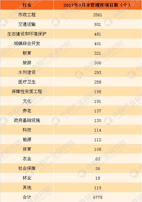 ? ? 截至2017年9月30日,中國各行業(yè)PPP管理庫項(xiàng)目數(shù)達(dá)到6778個。其中,市政工程、交通運(yùn)輸、生態(tài)建設(shè)和環(huán)境保護(hù)項(xiàng)目數(shù)居前三位,分別為2561個、931個和481個,合計(jì)占同口徑全國總數(shù)的58.6%。