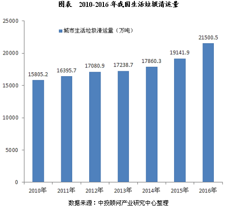 ? ? 中投顧問發(fā)布的《2018-2022年中國(guó)生活垃圾處理行業(yè)深度調(diào)研及投資前景預(yù)測(cè)報(bào)告》數(shù)據(jù)顯示:2016全國(guó)生活垃圾清運(yùn)量約為21500.5萬噸。