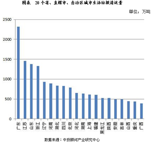 ? ? 廣東省、江蘇省、山東省的生活垃圾清運(yùn)量位居全國(guó)前三位,分別達(dá)2320.4萬噸、1456.07萬噸和1377.49萬噸,而浙江省的垃圾清運(yùn)量?jī)H比山東省少45萬噸,而屈居第四位,其余27個(gè)省級(jí)行政區(qū)域垃圾清運(yùn)量均未超過千萬噸大關(guān)。廣東、江蘇、山東、浙江四省的生活垃圾清運(yùn)量達(dá)6486.62萬噸,占全國(guó)生活垃圾清運(yùn)量的33.89%。