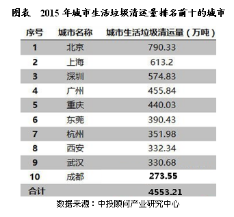 ? ? 在全國(guó)661個(gè)設(shè)市城市中,生活垃圾清運(yùn)量前三名的城市分別為北京市、上海市和深圳市,分別為790.33萬噸、613.2萬噸和574.83萬噸。前十名城市的生活垃圾清運(yùn)量達(dá)4553.21萬噸,占全國(guó)城市生活垃圾清運(yùn)量的23.79%。排名前十的城市垃圾清運(yùn)量見下表。