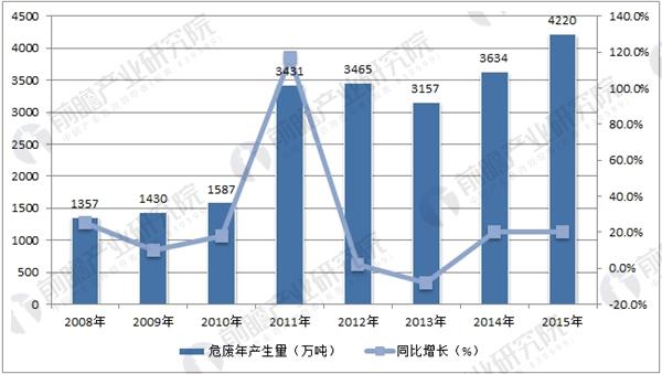 ? ? 根據前瞻產業研究院發布的《危廢處理行業市場前瞻與投資分析報告》統計數據,2015年全國危險廢物產生量達4220萬噸,較2014年增長16%。危廢產生量仍呈現不斷上升趨勢。從發達國家的經驗來看,危險廢物產生量為固體廢物的3%左右。我國近幾年工業固廢產量在30億噸左右,估算當前危險廢物的實際產量達6000-10000萬噸。
