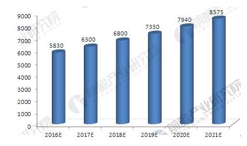 2016-2021年中國工業固體廢物市場容量預測(單位:億元)