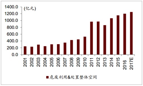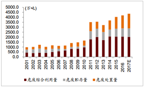 ? ? 我們如果按照目前已有的市場存量來計算, 然后按照綜合處臵費用 1500 元/噸,無害化處臵 3500 元/噸, 貯存填埋 300 元/噸,以及綜合利用單位附加值 2000 元/噸來進行總的粗略計算,則 2017 年我國現有危廢存量空間將達到 1250 億元以上。 需要注意的是,我們沒有考慮到瞞報漏報的數量,如果考慮進約 4000 萬噸每年的官方未統計數量, 實際需求空間將超過 2000 億元。