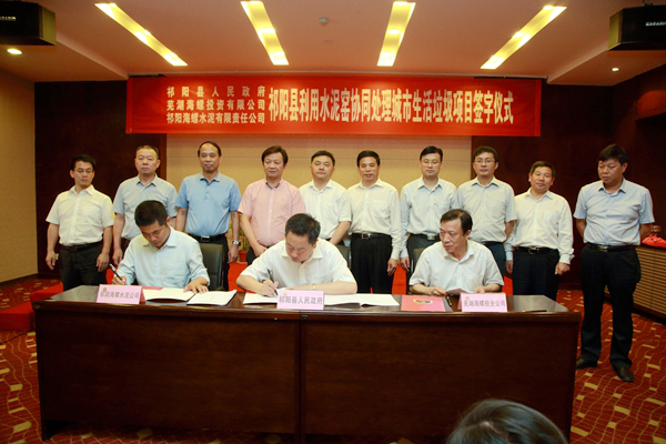 ? ? 周新輝、紀勤應、陳小兵分別代表祁陽縣政府、蕪湖海螺投資有限公司及祁陽海螺水泥有限責任公司在合作協議上簽字。協議約定項目由蕪湖海螺投資有限公司投資、建設和運營,在祁陽海螺廠區內建設一套日處理能力為300噸的利用水泥窯協同處理城市生活垃圾系統。祁陽縣政府負責祁陽縣域內的垃圾統籌收集、中轉、運輸和保量。