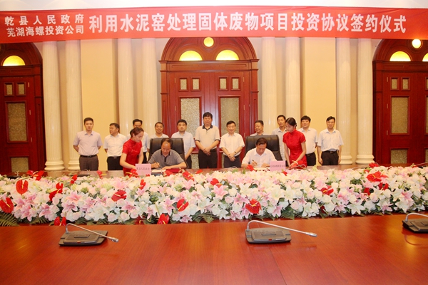 ??? 8月7日下午,乾縣人民政府、蕪湖海螺投資公司在海螺國際會議中心六樓東海廳正式簽署了在乾縣建設利用水泥窯處理固體廢物項目投資協議,茍曉瑜、紀勤應分別代表乾縣政府、蕪湖海螺投資公司在投資協議上簽字。