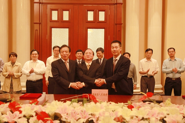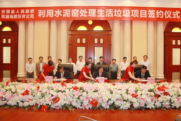 ? ? 2014年10月23日上午,扶綏縣人民政府、海螺創(chuàng)業(yè)公司、扶綏海螺水泥公司在蕪湖海螺國際會議中心正式簽署了《扶綏縣利用水泥窯處理生活垃圾項目合作協(xié)議》,扶綏縣縣委書記藍(lán)大煌,縣委常委、副縣長許家愷;海螺創(chuàng)業(yè)總經(jīng)理紀(jì)勤應(yīng)、戰(zhàn)略企劃部部長卜華松;扶綏海螺水泥公司總經(jīng)理萬長寶等參加了簽約儀式。許家愷、紀(jì)勤應(yīng)、萬長寶分別代表扶綏縣政府、蕪湖海螺投資公司及扶綏海螺在合作協(xié)議上簽字。